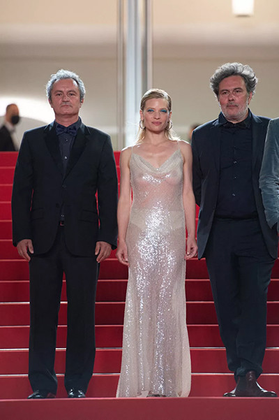 その4年後の2021年、フランスの女優メラニー・ティエリーは、7月12日の映画『フレンチ・ディスパッチ』上映会の大階段で、ディオールのスモーキーグリーンのドレスを纏い、さらに翌7月13日の映画『Tralala』上映会の大階段で2度の誘惑を放った。ショーツの上から纏ったスパンコールがきらめくトランスペアレンなセリーヌのクリエイションは、2021年版のハイライトとなった。