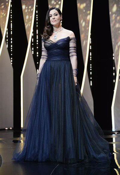 第70回カンヌ国際映画祭のオープニングセレモニーで、モニカ・ベルッチは、全体が透けたインペリアルネイビーのドレスでパレ・デ・フェスティバルのステージに登場し、ステージパートナーのアレックス・ルッツと熱のこもったキスを交わした。それと同時に、胸元がちらりとのぞくディオールのシースルードレスの催眠術のような力によって、神話的な瞬間が刻まれた。