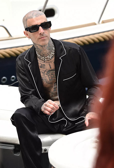 46歳のミュージシャン、トラヴィス・バーカーは、黒いズボンとジャケット姿。(2022年5月23日、ポルトフィーノ)