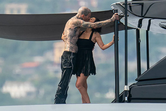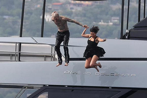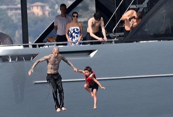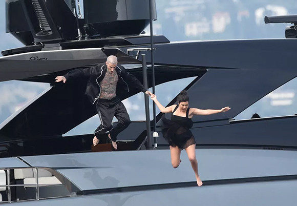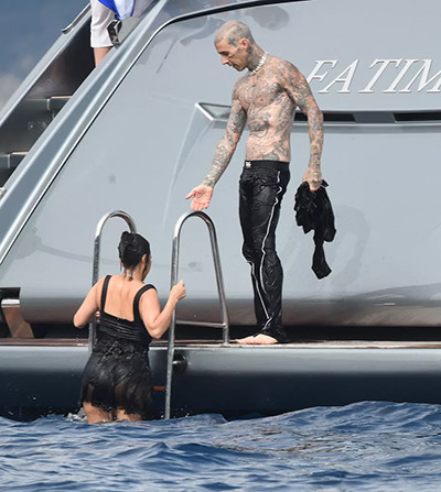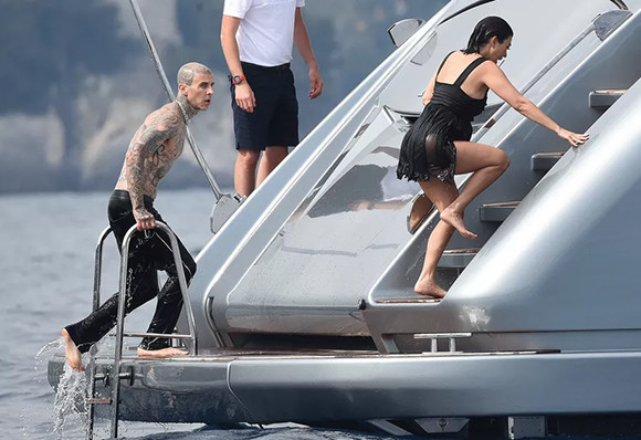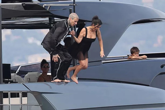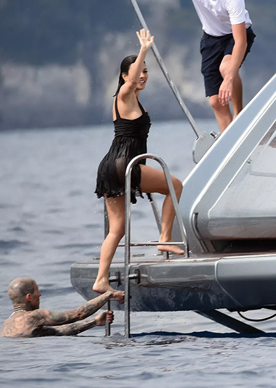 ヨットに戻る妻に手を差し伸べるトラヴィス・バーカー。(2022年5月23日、ポルトフィーノ)