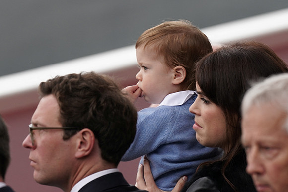 最終日の5日、両親と一緒にプラチナ・ジュビリー・ページェントをスタンドから見守ったのは、ユージェニー王女の長男で生後8ヵ月のオーガストくん。母親の膝に乗せられたオーガストくんは、ユニオンジャックのセーターを着て、曽祖母のビッグイベントをお祝いした。コッパーブラウンの髪色に面長の顔立ちで、父であるジャック・ブルックスバンク氏似だと早くも話題に。