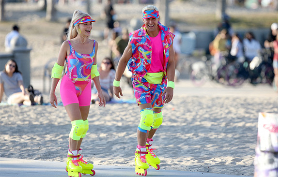 マテル社の有名な人形が主役の映画撮影が進行中だ。主演2人の初共演シーンが撮影された時に俳優たちが着ていた服はネオ・ウェスタン調だった。2回目の撮影となる今回は、ネオンカラーのローラーブレードにピンクの衣装を着た姿をキャッチ!