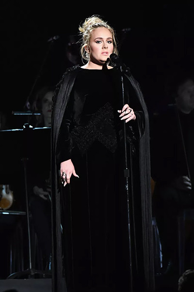 荘厳なケープドレスで、第59回グラミー賞にてジョージ・マイケルへのオマージュを捧げるアデル。(2017年2月12日、ロサンゼルス)