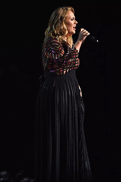 鱗状にプリーツ加工が施されたジバンシィによるロングドレス。第59回グラミー賞で、ポップなカラーを数種類選んだアデル。(2017年2月12日、ロサンゼルス)