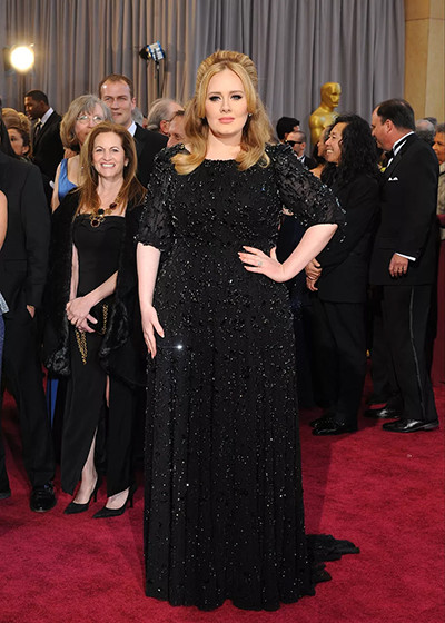第85回アカデミー賞で、アデルはビーズのロングドレスを着用。(2013年2月24日、ロサンゼルス)
