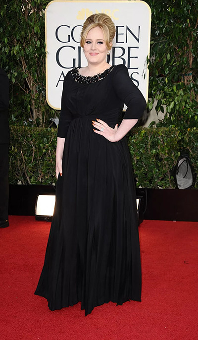 ゴールデングローブ賞の「ベスト・オリジナル・サウンドトラック」賞を受賞したアデルは、ビーズの襟が付いた黒いドレスを着た。(2013年1月13日、ロサンゼルス)