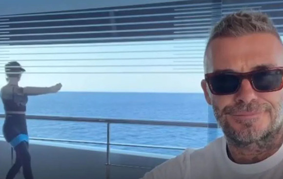 デビッド・ベッカムがインスタグラムに投稿した動画は、ヨットのデッキの背後にワークアウト中の妻・ヴィクトリア・ベッカムが写り込んだユニークなものだった。