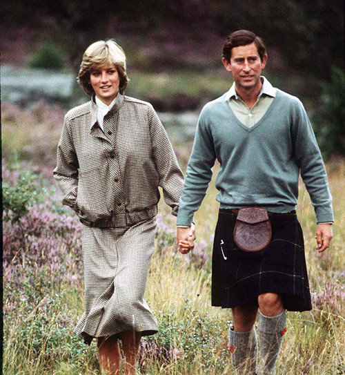 ダイアナ妃とチャールズ皇太子が、新婚旅行後に訪れたスコットランドのディー川沿いでカメラマンにポーズをとる。(バラター、1981年8月19日)