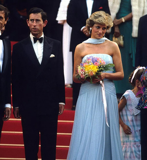 カンヌ映画祭の階段に立つダイアナ妃とチャールズ皇太子。(カンヌ、1987年5月16日)