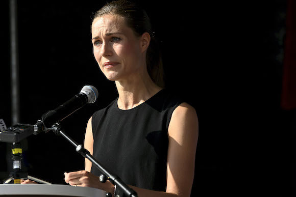 涙をこらえて演説するサンナ・マリン首相。photography : AP/Aflo