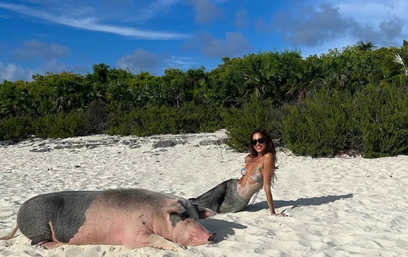 おでこにゴーグルを着け、締まった腹筋を見せつけた俳優のブラッドリーは、豚に水を与えていた。トップモデルのイリーナは、砂浜で寝ている豚と一緒に過ごしたり、屋外の豚小屋で過ごしたり、「新しい友達」と一緒にポーズをとっている。また、サメが集まる橋に座り、少し緊張したポーズを見せた。