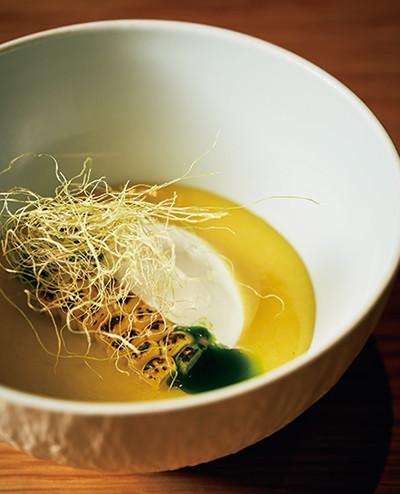 料理はいずれも¥13,200のコースから。上:「馬肉 タルタル」。甘味があって濃厚な金木町の馬肉には、田子のニンニクで香りづけしたパン粉が入り、食感も楽しい逸品に。下:水と塩で仕上げた「トウモロコシの冷製スープ」。透明感のある味わいで、青森産ハーブのオイルがアクセント。