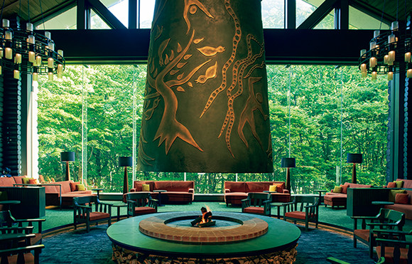 ロビーには高さ8.5mにもなる岡本太郎の『森の神話』。奥入瀬渓流に生息する鳥やキノコ、森が共生している様を表現。