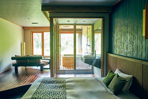 さまざまなタイプの部屋を用意。写真は半露天風呂付きの渓流ツイン。