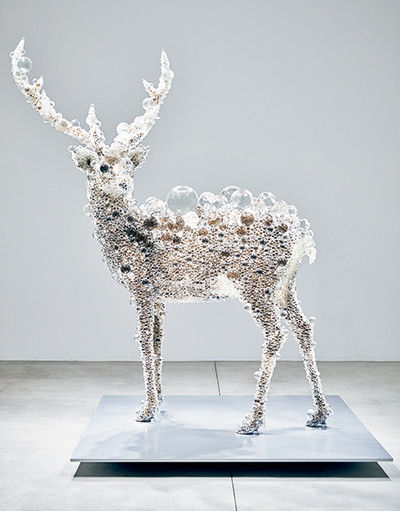 名和晃平の『PixCell-Deer#52』。鹿の剝製の表面を透明な球体で覆い、のぞき込むとレンズのような役割になる。