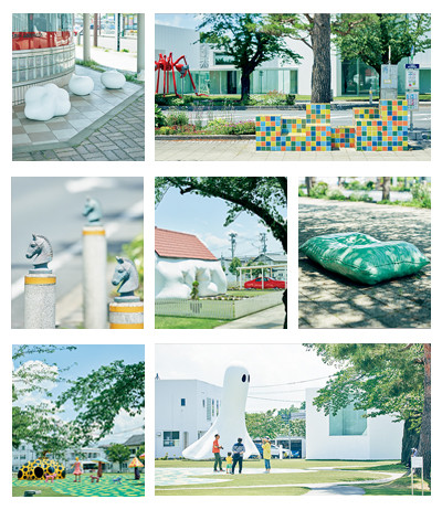 現在、12のアートが「まちなか常設展示」や「ストリートファニチャー」として美術館の周辺に置かれている。上段左:商店街の通り沿いにある近藤哲雄による『ポット』。雲のようなオブジェは、ベンチや花壇として活用されている。 上段右:バス停横には、マイダー・ロペスの『トゥエルヴ・レベル・ベンチ』が。 中段左:作品ではないが、ポールにも馬のオブジェ。十和田には、馬のブロンズ像や蹄をかたどった道端アートが点在する。中段中:エルヴィン・ヴルムによる『ファット・ハウス』と『ファット・カー』。時間によって、家の内部も公開される 中段右:巨大な枕のように見えるリュウ・ジァンファの『マーク・イン・ザ・スペース』は官庁街通りにふたつある。 下段左:美術館の向かいに広がるアート広場。展示されているのは、草間彌生の『愛はとこしえ十和田でうたう』 下段右:インゲス・イデーの『ゴースト』。アート広場を浮遊しているかのように見える。