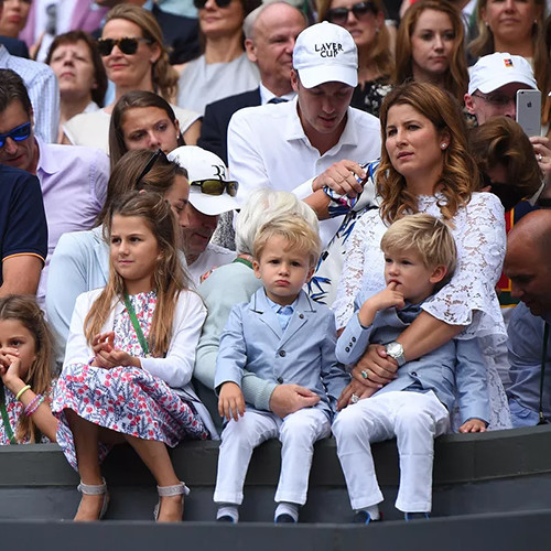 ミルカ・フェデラーと子供たち:双子のマイラとシャーリーン、双子のレオとレナート。(2017年7月16日、ウィンブルドンにて)photography: Abaca