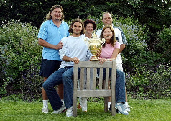 やがて二人は切っても切れない仲になり、とても仲が良い。(ピーター・ラングレンコーチ、ロジャーの母リネット・フェデラー、理学療法士のパベル・コヴァックと)(2003年7月6日、ロンドン)