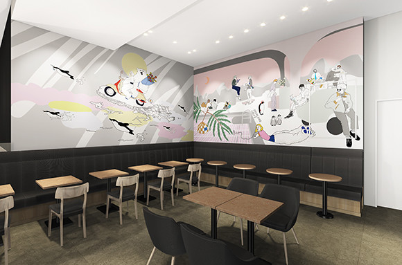 アーティストとしての大きな初仕事となったエクセルシオール カフェ ダイバシティ東京 プラザ店のアートワーク。