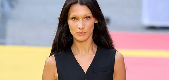 ステラ・マッカートニー2023年春夏コレクションショーに登場したベラ・ハディッドとブリーチ眉毛。photography: Imaxtree