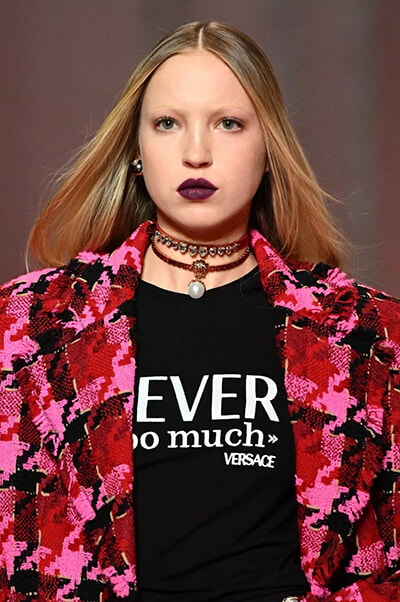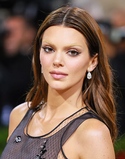 ケンダル・ジェンナーは、ボリュームのあるつけまつ毛とシンプルなヌードカラーの口元で、ルックを完成させた。プレシャス・リーとメイジー・ウィリアムズは、ブリーチ眉毛に太めのブラックアイライナーを組み合わせている。ブリーチ眉毛は、3人のナチュラルな茶髪とのはっきりしたコントラストを生み出している。
