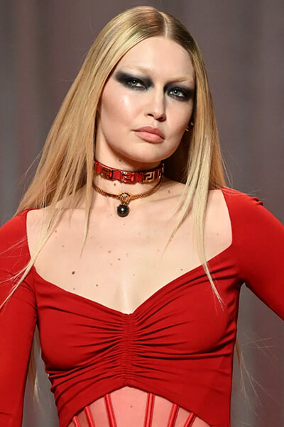 ミラノで行われたヴェルサーチェの2022-2023年秋冬コレクションのショーに登場したジジ・ハディッド。