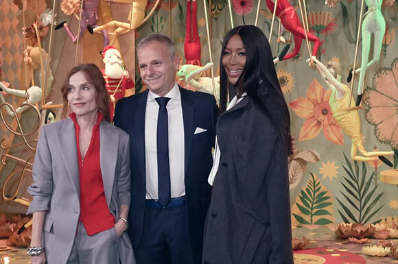 プランタンデパートのCEO、ジャン=マルク・ベレシュを囲んだイザベル・ユペールとナオミ・キャンベル。photography: Stephane Cardinale/ Getty Images