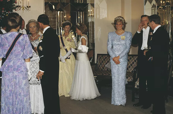その35年前、同じホテルで行われたモロッコのハッサン国王の晩餐会に、彼らの叔母であるダイアナ妃が登場した。(ロンドン、1987年7月)