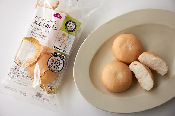 全国展開する大型スーパー、イオングループのプライベートブランドが目指すのは、手に入れやすくおいしい米粉パン。「おこめでつくったふんわりパン」は、賞味期限が3カ月というロングライフ商品で、防災用のローリングストック食品としても使いやすい。電子レンジで温めれば、米粉パンらしい、もっちり感が味わえる。