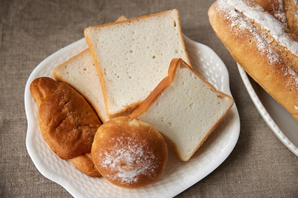 米粉の食パンは生地のキメが細かく、ふんわりしっとりしていて、口内ですっと溶ける。丸パンや塩バターロールなども、言われなければ米粉パンとは気づかないほどだ。