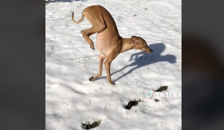 雪の上を歩くのが極度に嫌いなイタリアン・グレーハウンドのニノが、なるべく雪に触れずに歩くために編み出した歩き方が面白すぎるとネット上で話題となっている。