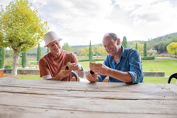 ブラッド・ピットの傍らにはビジネスと友情で結ばれたパートナーのペラン家が勢揃いしている。何年も前からペラン家は高名な科学者の協力を受け、ブドウ成分の研究を行ってきた。ワインと健康の関係を研究するピエール=ルイ・テセドル教授と遺伝学者のニコラ・レヴィ教授だ。ペラン家は早い段階からブラッド・ピットと研究内容を共有してきた。