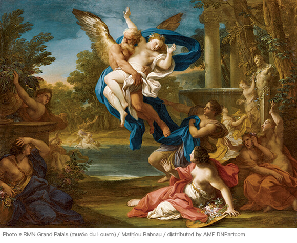 自らの欲望に忠実なギリシャ・ローマ神話の神々は気に入った女性を誘拐することもある。この絵は白髪の老人の姿をした北風のボレアスが、王女オレイテュイアを連れ去る場面。翼を広げたボレアスはオレイテュイアを抱きしめ、飛んでいく。画面下部ではオレイテュイアと遊んでいた自然物の精のニンフたちが驚き、慌てふためいている。同様の主題はルネサンス以降、多くの絵に描かれた人気のモチーフだった。