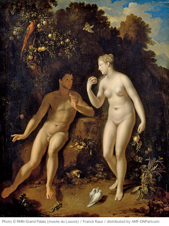 展覧会の4つの章に先立つプロローグに登場。キリスト教における人類最初の夫婦、アダムとエバが描かれる。この場面は蛇にそそのかされたエバが、神から禁じられていた善悪を知る知識の木の実を口に運ぼうとしているところ。禁断の果実を食べたふたりは裸であることを意識し、恥ずかしくなり、神の怒りに触れて楽園を追放される。神は罰として女性には出産の苦しみを、アダムにはいずれ土に還ることを預言した。