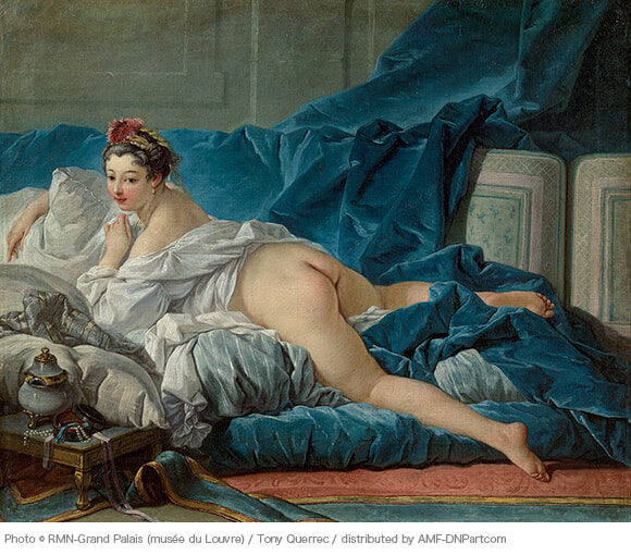 18世紀フランスの巨匠ブーシェが描いた、なまめかしい女性像。頰を上気させ、誘うような視線をこちらに向ける。画面中央にふっくらとした臀部(でんぶ)が描かれ、見る者の視線を集める。モデルはギリシャ・ローマ神話の女神でも文学の登場人物でもない、無名の女性だ。彼女が寝そべるトルコ風と呼ばれていたソファなどは、18世紀ヨーロッパの人々がイスラム世界のハーレム(後宮)に対して抱いていた幻想をもとにしている。