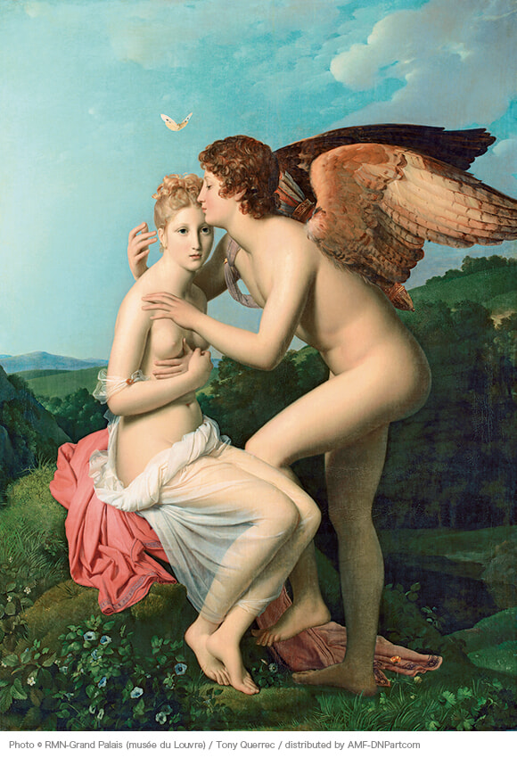王女プシュケはその美貌を妬んだ女神ヴィーナスの策略で、夫・アモルの姿を見ることを禁じられていた。ところがある晩プシュケはランプの灯りでアモルの姿を見てしまい、アモルは飛び去っていく。ふたりは試練を乗り越えて再会し、天界で結婚式を挙げる。新古典主義の画家ジェラールの絵は、アモルがプシュケにそっと口づけする場面を描く。頭上の蝶は「プシュケ」がギリシャ語で蝶と魂を意味することから描かれた。