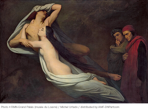 14世紀イタリアの詩人ダンテの『神曲』、「地獄篇」に登場するパオロとフランチェスカの悲恋を描く。夫の弟パオロと恋に落ちたフランチェスカはその罪により、亡霊となって永遠に地獄を彷徨っていた。画面の対角線上に描かれた悲劇のふたりは固く抱き合いながら地獄の風に吹かれている。右端にはダンテ、その左側には地獄を案内する古代ローマの詩人ウェルギリウスがもの思いにふけりながら恋人たちを見つめている。
