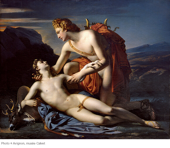 アポロンが愛した美少年キュパリッソスの神話は19世紀フランスの新古典主義美術でよく取り上げられる。可愛がっていた牡鹿を間違って殺してしまったキュパリッソスは永遠に嘆き続けたいと神に願った結果、糸杉に変身する。この絵では牡鹿にもたれかかるキュパリッソスをアポロンが優しく支える。中性的な裸体は当時の人々にとって、思春期の若者の理想的な身体表現だったようだ。破滅的な愛を描く、ロマン主義的でもある作品。