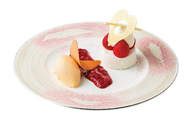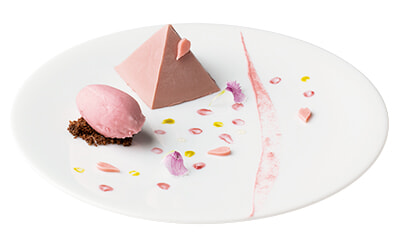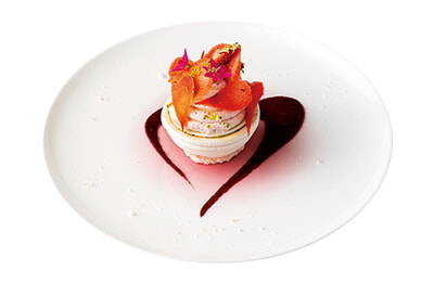 メレンゲをうつわに見立てたフィリップ・ミル東京の「苺とバジルのマルムラード ムースフロマージュブラン」。ランチコース¥4,620~、ディナーコース¥8,800~より。