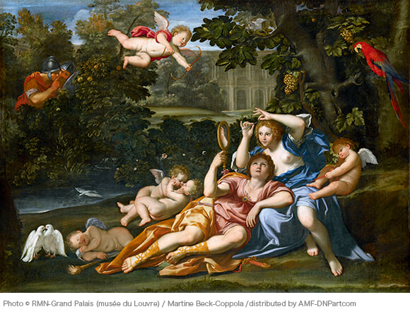 ギリシャ・ローマ神話では、ヴィーナスの息子であり愛の神でもあるアモル(キューピッド)が放った矢が心臓を射抜くと、恋に落ちるとされていた。キューピッドはさまざまな愛の中で「性愛、恋愛」を司った。この絵は愛が生まれた瞬間を描いたもの。画面上部でアモルが恋人たちに捧げる月桂冠を掲げている。