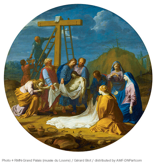 キリスト教では神が我が子イエスを地上に遣わし、人々の罪をあがなうために十字架にかけられたと説く。神から人類に対する究極の愛だ。この絵は磔刑(たっけい)の後、息絶えたイエスの身体を十字架から降ろす場面。イエスの足に口づけしているのはイエスによって正しい道に導かれたとされるマグダラのマリア。右端では聖母マリアがイエスに向かって右腕を伸ばしている。抑制の効いた表現がかえって悲しみを誘う。