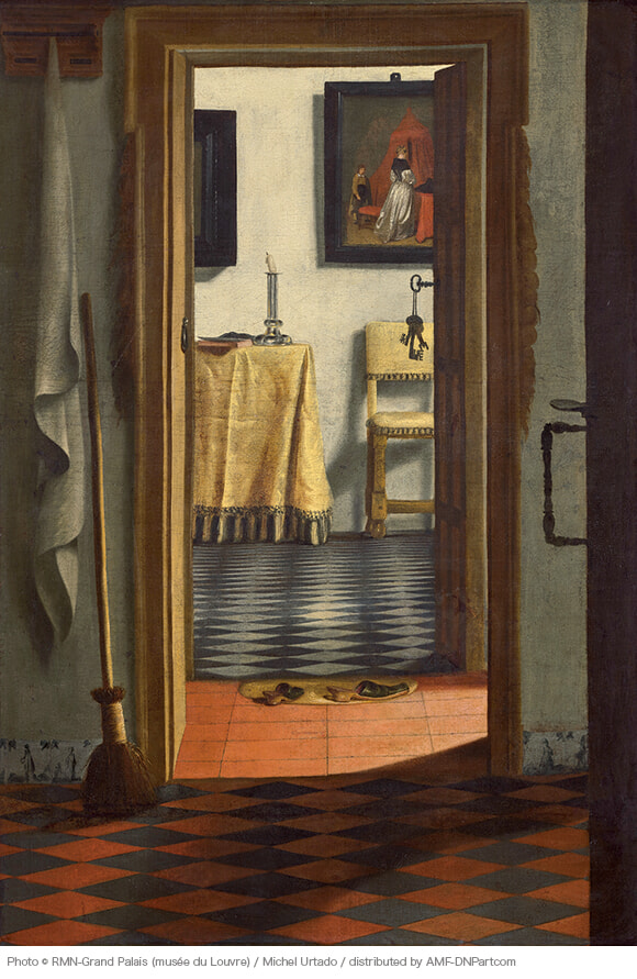 登場人物はいないが、脱ぎ捨てられた部屋履き、鍵が挿さったままの扉……と謎めいたモチーフが愛を暗示する。この家の女主人はどこかで禁じられた誘惑に身を委ねているのだろうか? 消えかかったロウソクの炎は、愛の火が燃え尽きるのを意味しているのかもしれない。人が描かれてないため、登場人物が何人なのか、どんな関係なのかもわからない。さまざまなことを想像させて興味は尽きない。