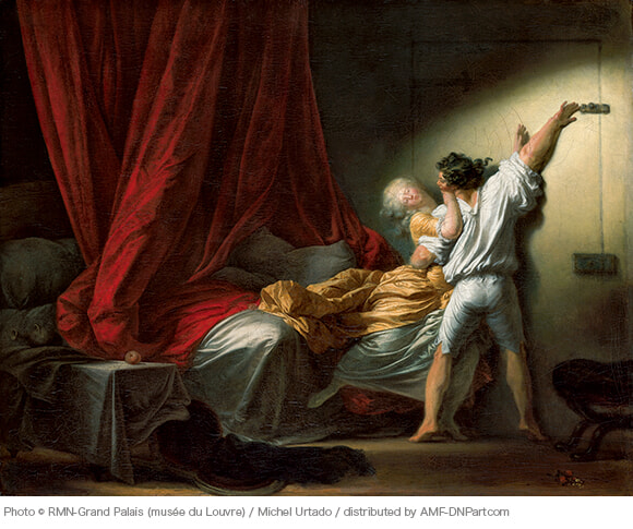 扉の閂(かんぬき)に手を伸ばす男性と、彼にしがみつく女性。女性は男性に抵抗しているのか、それとも彼に身を預けているのだろうか。乱れたベッドは愛の営みを連想させ、テーブルの上のリンゴはエバが口にした禁断の木の実を思わせる。緊張感とエロティシズムにあふれる画面は愛の駆け引きとも解釈できるし、道徳的な戒めとも考えられる。ひとつの意味ではなく、さまざまに解釈できるのがこの絵の持ち味だ。