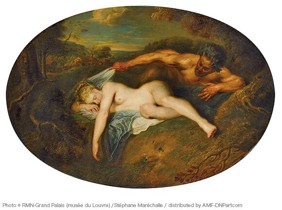 相手に気付かれないうちに一方的に見るという行為も欲望の表出だ。見る者は強い立場に、見られる者は弱い立場に置かれる。これは人間の身体とヤギの脚を持つサテュロスが、眠っているニンフを見ているところ。ベールをそっと持ち上げて裸体を覗き見るサテュロスの視線には濃厚なエロティシズムが漂う。こちらの主題もティツィアーノやルーベンスら、多くの有名な画家たちが取り上げている。