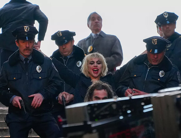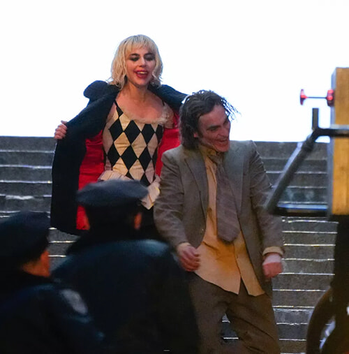 ふたりがスタッフメンバーを助けるシーンも撮影された。というのも、メンバーのひとりは手すりの上に落ちてしまったのだ。ふたりの俳優は、撮影を再開する前に、そのスタッフが元気であることを確認した。この映画の最初の舞台裏ショットは3月末に公開された。赤いスーツにレザースカート、ピエロのメイクをした37歳のレディー・ガガは、ゴッサムシティの街角であるシーンを演じた。看板で武装した群衆に囲まれた彼女は、12人の警察官に護衛された。