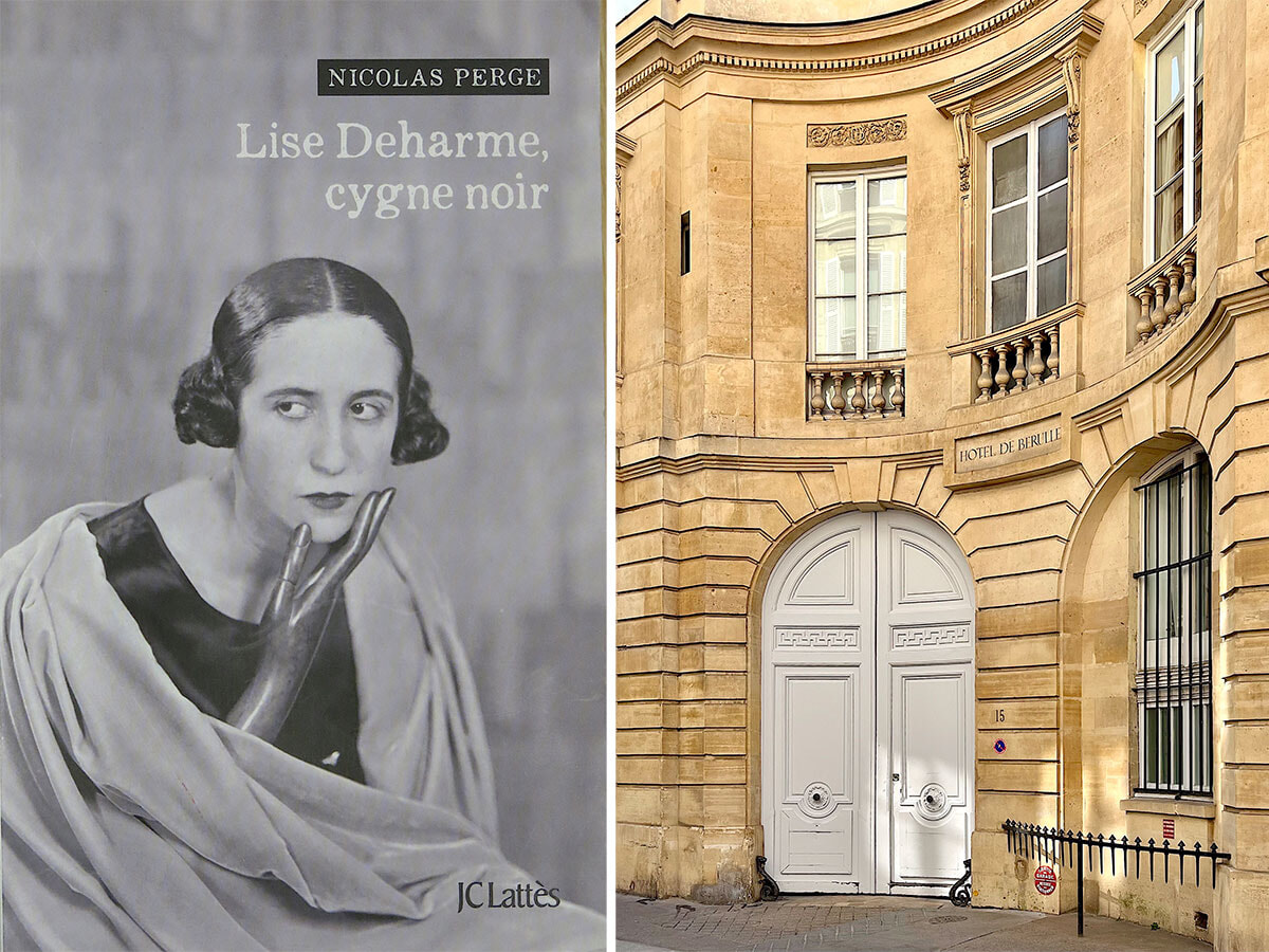 左: 昨年Jean Claude Lattès社から出版されたNicolas Perge著『Lise Deharme, cygne noir(リーズ・ドゥアルム、黒鳥』。表紙はマン・レイが撮影したリーズ。右: パリ7区グルネル通り15番地。1924年、ここに開かれたシュルレアリスム研究所にリーズはアンドレ・ブルトンを訪問した。ミューズ誕生の地だ。