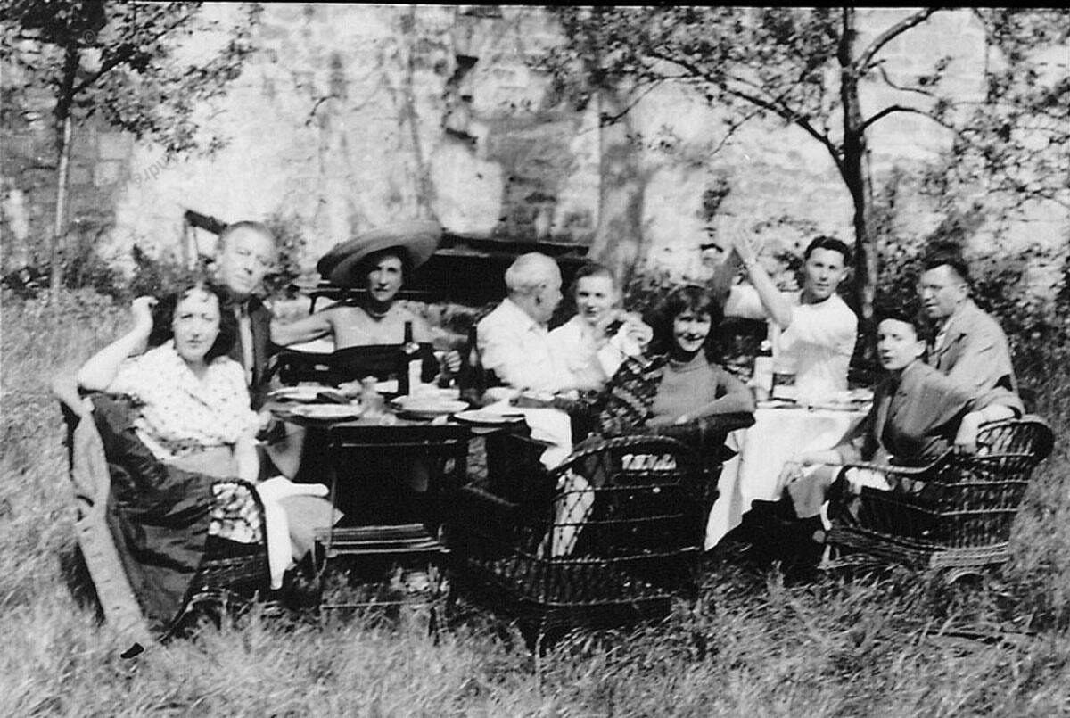 1935年、イエールのヴィラ・ノアイユにて。左端に家の主でリーズの友人のマリー=ロール・ドゥ・ノアイユ、その隣がアンドレ・ブルトン、そしてリーズ。photo: D.R.