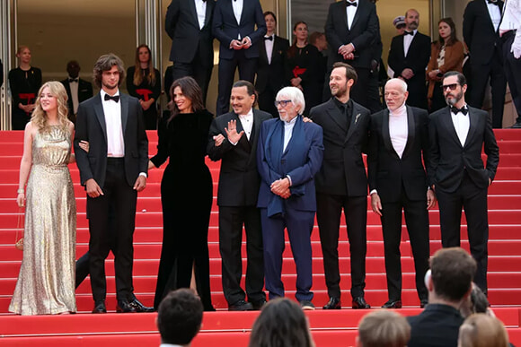 (左から)ポーリーヌ・ポルマン、ディエゴ・ル・ファー、マイウェン監督、ジョニー・デップ、ピエール・リシャール、ベンジャミン・ラヴァ―ヌ、パスカル・グレゴリー、そしてメルヴィル・プポー。(カンヌ、2023年5月16日)