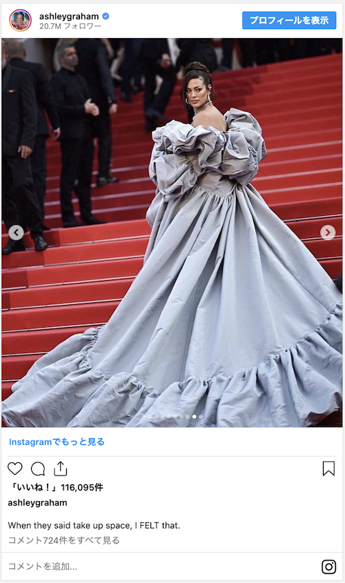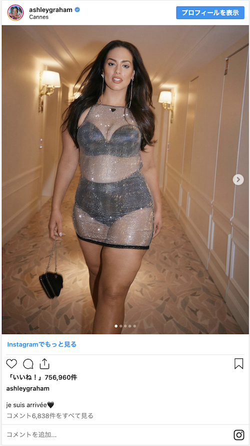 この前日には、プラダのシースルーのフィッシュネットミニドレスを着てホテルの廊下を歩く写真を自身のインスタグラムに投稿し、“Je suis arrivée(到着した)”と、フランス語のキャプションを添えた。そして翌日の夜、アシュリー・グラハムはカンヌの大階段で、自らの役割を見事に果たした。