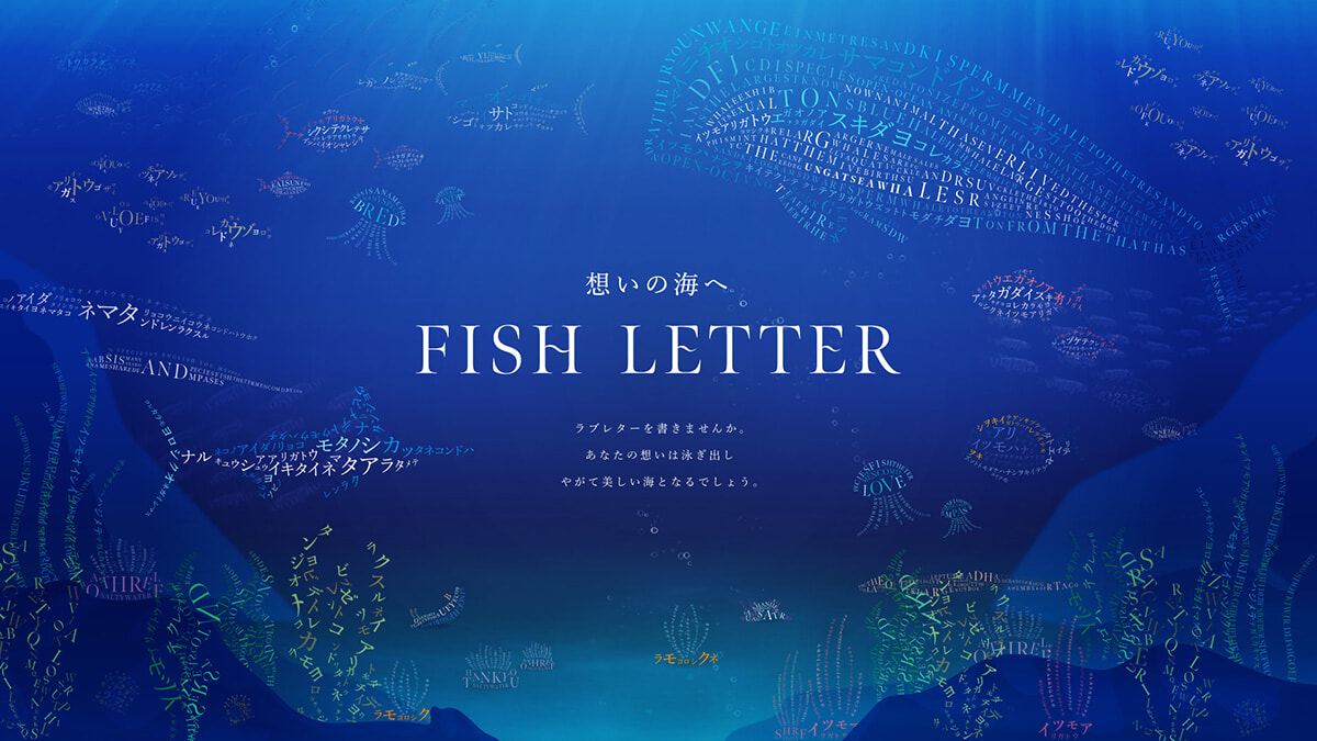 現在、真珠養殖成功130周年の記念プロジェクトの第3弾として公開されているのが「FISH LETTER」だ。同サイトにメッセージを打ち込むと、文字や記号が40匹以上の海洋生物の形となってインタラクティブな海の世界へと泳ぎ出す。メッセージは特定の誰かに直接送ったり、一般公開を選択して海へ放つことも可能だ。
